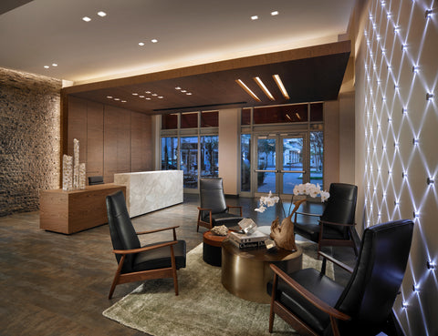 Glass wall partitions and staircase railings help facilitate the feeling of a larger, more open space, allowing the homeowners to take in the home’s breathtaking city and inter-coastal views.
