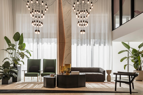 Monochromatic and neutral color palettes were brought in for spatial symmetry throughout and juxtaposed with splashes of navy, hunter green, black and pastels for identifiable contrast in each required area of interest. Greeted with Marset Nunefer pendants dancing in the natural light provided by the double-height foyer designed to highlight the monolithic size of this communal refuge, the entryway to the Lake Vista Clubhouse is flanked with custom, soft concrete finished floating benches anchored in gray large format porcelain-tiled walls for an elevated multi-dimensional look. Keeping in mind the need to maximize the space of the main seating area, the expanse is tied together by a large custom viscose and wool taupe-colored area rug while including separate seating arrangements for the simultaneous enjoyment of different groups. The larger seating section is easily identified by modern semi-gloss tricorn black wall paneling and a mounted entertainment console. The smaller, more intimate seating section is identified by the continuation of the main entrance’s gray large format porcelain-tiled walls set with a minimalistic custom art piece, designed by Founder and Creative Director - Raymond Jimenez, consisting of a large, off-white canvas and clustered Puck wall sconce from Vibia mounted on top.