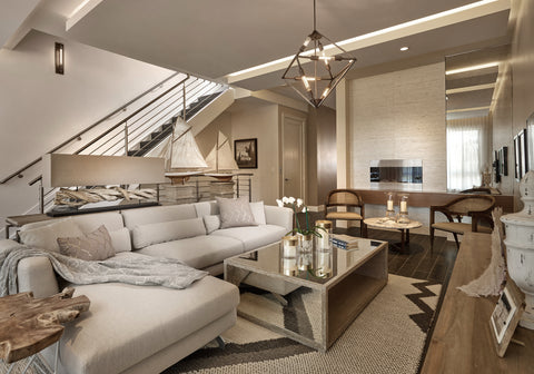 The cement tones are further seen in the rest of the home through thoughtfully curated accessories. Rich reclaimed wood side tables are perfectly paired with white-washed accessories, further emphasizing the industrially eclectic juxtaposition of the design aesthetic.