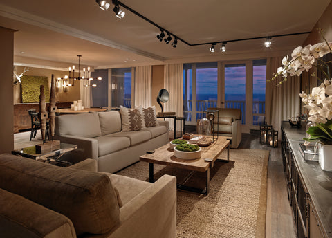 Past the kitchen, the neutral color scheme makes up the living room space with its adjacent floor-to-ceiling windows, harmoniously providing expansive oceanfront views of Fort Lauderdale's captivating beaches. Directly across, a taupe, leather L-shaped sofa lines the windows, creating a soft conversation with its neighboring beaches, landscape, and opulent courtyard. In the middle of the sitting area, a coffee table also from Holly Hunt, humbly brings the outside in with its orb concrete stone-like shape, minted in varying textures and different shades of gray. Beneath, an off-white area rug with a deep gray smokey pattern from The Rug Company brings the space together with an added layer of texture, creating a contemporary yet cozy allure. Built into the Ipe wood ceilings, a hidden LED pocket paired with industrial surface mount Delta light fixtures provide the perfect balance of subtle indirect cove lighting and intentional/ direct accent lighting.