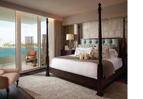 Raymond Nicolas added an additional layer of visual intrigue through the installation of a wavy, metallic wallpaper that catches the eye alongside the entire east wall leading from the foyer, through the staircase, and into the living room. Custom ceiling and lighting designs round out the modern design scheme, complementing the overall white, black, and silver color palette.